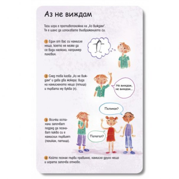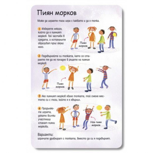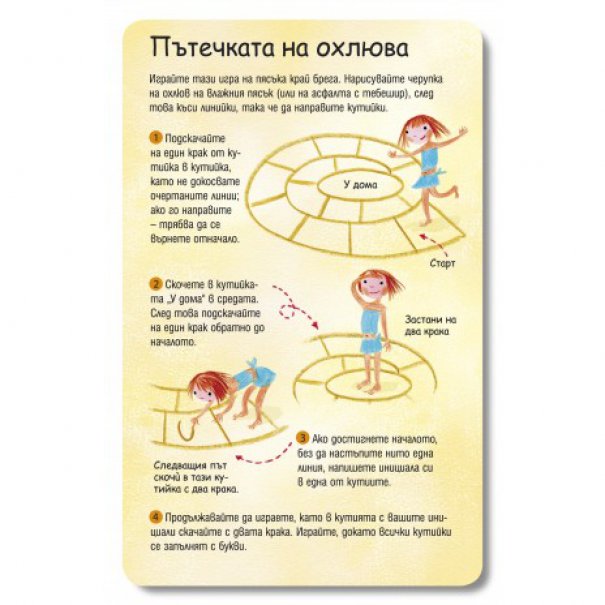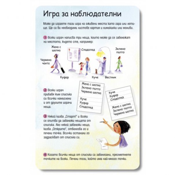 Игрите са 100 и са най-различни – от такива които изискват отворени пространства и топка („Пиян морков“ и „Дремещи кученца“), през игри за дълъг път („Изяж азбуката“ и „Игра за наблюдателни“), до такива, които могат да се играят в дъждовно време – „Смигащият убиец“ и „Разкажи история“. Вече ги изпробвахме – децата се влюбват в тях и се налага да ги носите където и да ходите. Насладете се на една по-спокойна ваканция.