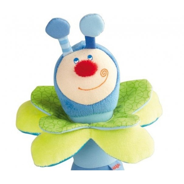 Забавна цветна текстилна играчка, която включва 2 пръстена- венчелистчета и тяло на бръмбар. Венчелистчетата са подвижни и Вашето дете може да се забавлява и упражнява едновременно. Горният тъмнозелен пръстен приятно шумоли, а вътре в тялото има нежно звънче. Разнообразието от ефекти привлича вниманието и стимулира сетивното възприятие на децата.