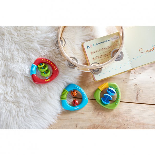 Качествена бебешка играчка Хаба, която съчетава 2 в 1 - дрънкалка и насърчава усещането за ритъм у детето. Двете звънчета осигуряват стимулиращи звукови преживявания за малките почитатели на немския производител ХАБА.