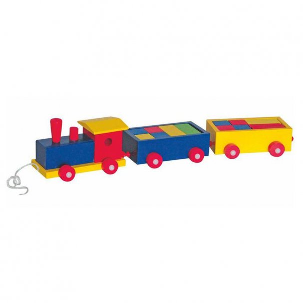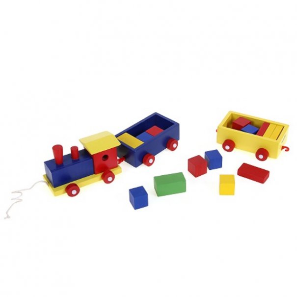 Забавен комплект за игра, съчетаващ в себе си любимия за всяко малко момченце влак, играчка за дърпане и конструктор.