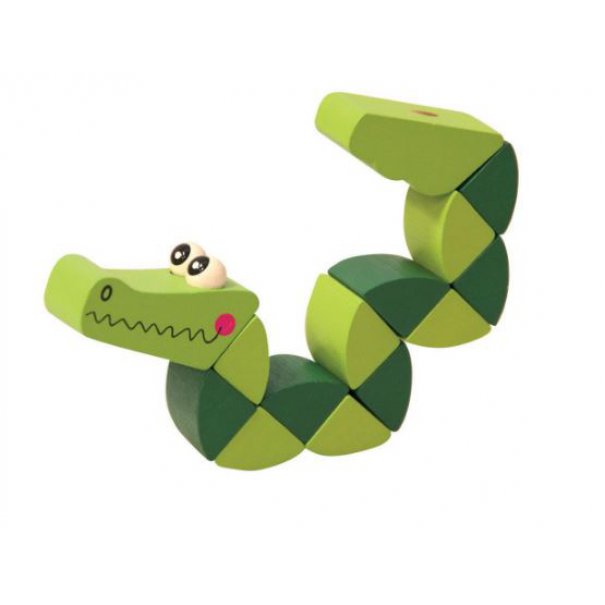 Дървеното крокодилче е класическа дървена играчка с подвижни елементи, свързани с плътен ластик помежду им. Това осигурява гъвкавост на елементите и устойчивост на връзката. Детето може да огъва и подрежда цветните триъгълничета, така че да създава различни 3D фигури. Играчката спомага за развитието на фантазията, пространствената ориентация, логическото мислене и фината моторика при най-малките.