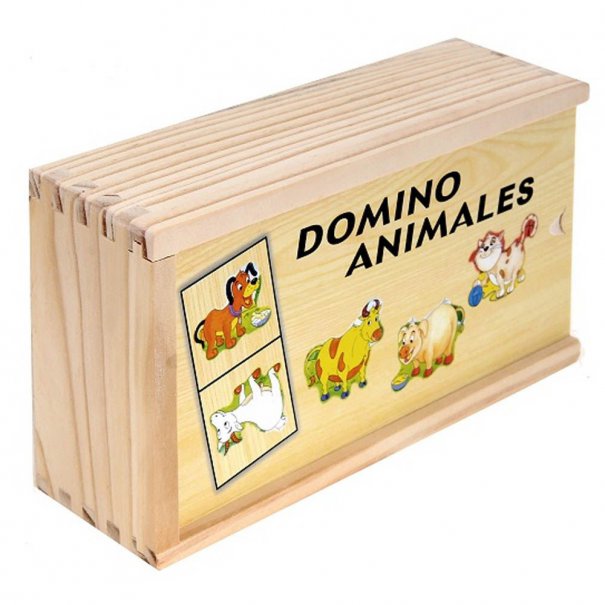 Комплектът съдържа 28 дървени домино-плочки с картинки на животни с размери 7.9 х 4 см в удобна за съхранение дървена кутия.