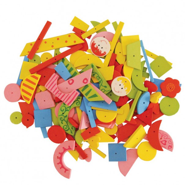 Дървените форми са с дупка, което максимално улеснява фиксирането им към дъската с пирончетата. Формите са с различни цветове и размери, което дава възможност за създаване на различни по сложност фигури. Пирончетата са метални, съобразени с възможностите на детето.