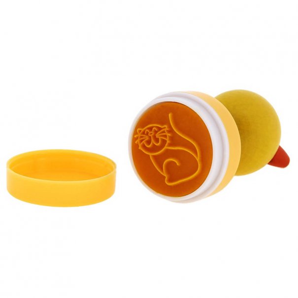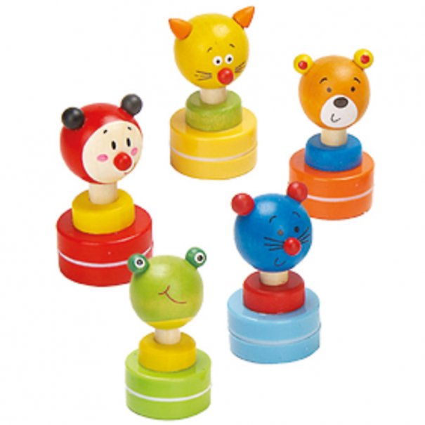 Дървените печати "Животни" се предлагат в 5 различни дизайна. Всеки печат е зареден със собствено мастило в различен цвят в съответствие с цвета на печата (жаба - зелено, мече - оранжево, калинка - червено, мишле - синьо, коте - жълто).