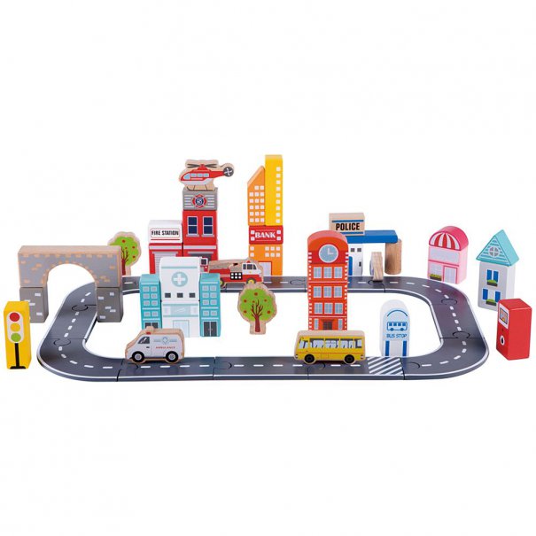 Конструктор с 49 разнообразни части, с помощта на които ще можете да построите цял град. Свържете пътя, постройте моста над него и добавете една по една останалите сгради.