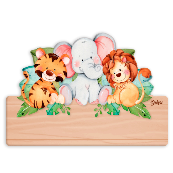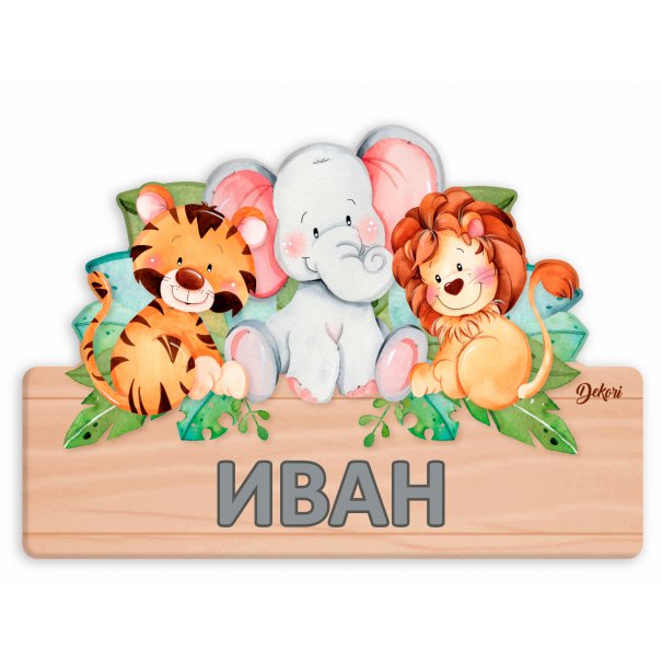 Красив детски аксесоар за обзавеждане с пъстър детски дизайн животните, които са наши приятели -слон, тигър и лъвче - табела на която може да изпишете ПЕРСОНАЛНО ИМЕТО НА ВАШЕТО ДЕТЕ и да залепите, където си пожелаете. Продуктите са боядисани с нетоксични бои на водна основа и отговарят на Европейска норма за безопасност EN-71.
