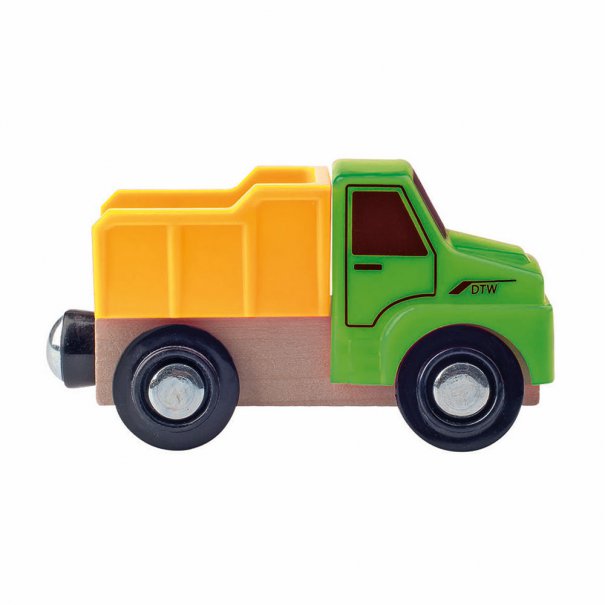 Комплектът съдържа 2 камиона, 1 ремарке, 1 товар, изработени от дърво и пластмаса.