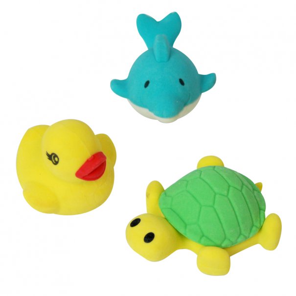 Комплект от три гумички с формата на познатите ни морски животни - пате, костенурка, делфин.