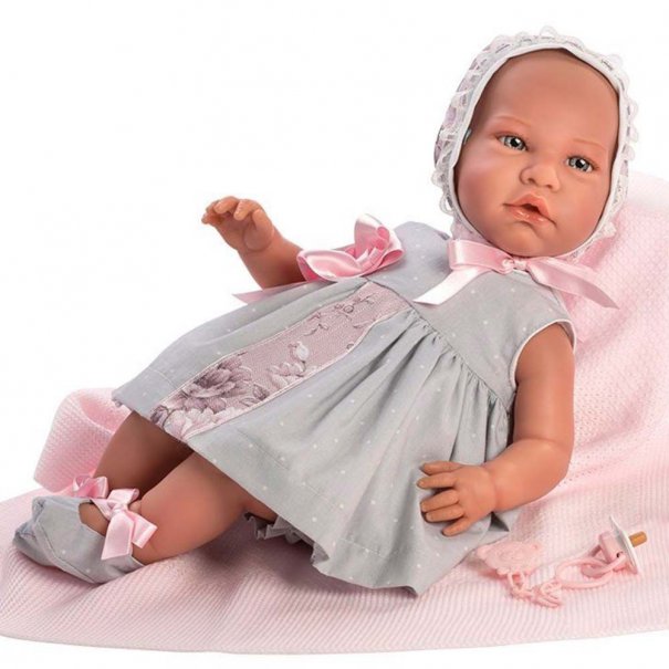 Куклата е облечена е с прекрасна рокля с дантели в сиво и розово. Тя носи красиви шапка и терлички. В комплекта ще намерите и одеало и биберон.