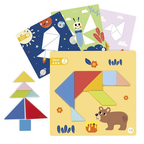 Комплектът съдържа 7 форми на танграм, 20 цветни илюстрации, върху които децата ще поставят танграм формите. Докато играят и се забавляват, малчуганите ще развият геометричните си умения и логическото си мислене, тъй като децата се учат как да създават различни фигури, като комбинират различни форми.
