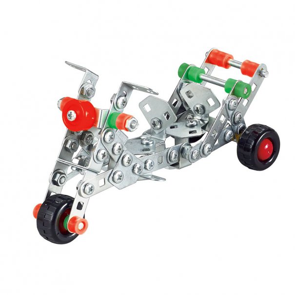 Метален конструктор от 159 части, идеален за начинаещи деца, които ще се научат как да сглобяват мотор от метални шини, болчета и гайки.