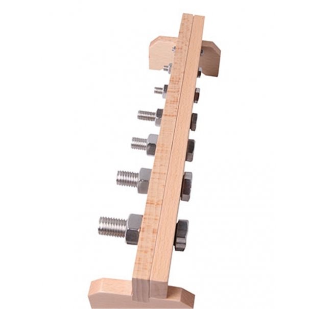 Този материал съдържа седем различни по големина болтове и гайки, които придържат дървена стойка, състояща се от две отделни части.