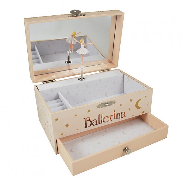 Голяма музикална кутия за бижута с чекмедже и поставка за пръстени. Отворете капака и навийте ключето - ще чуете очарователна мелодия и ще наблюдавате нежната балерина как се върти в ритъма на музиката.