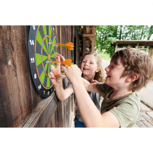 Тази немска игра на Хаба съдържа всичко, което играчите на дартс трябва да започнат: дартс табло, стрели и тефтер за записване на резултата от играта