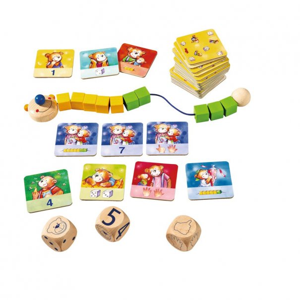 Съдържание: 1 Броеница Умното мече, 1 зар с числа, 1 зар с ръце/пръсти, 1 зар с точки, 40 карти, Комплект инструкции