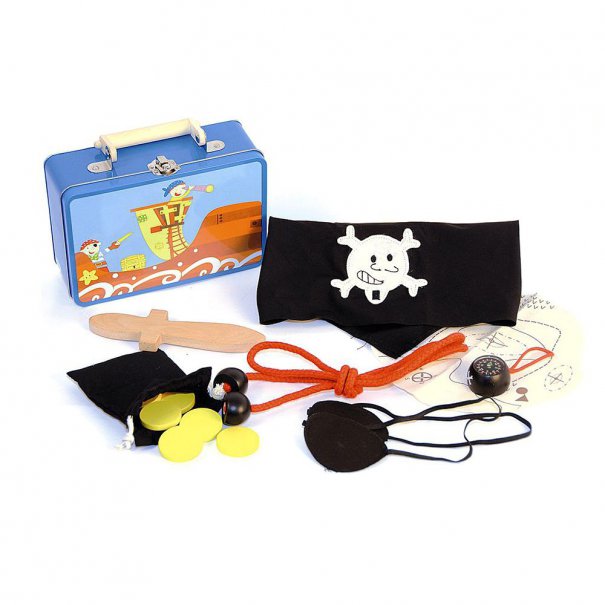 Комплектът се състои от 14 части. В куфарчето детето ще намери кърпа за глава с пиратски знак, две черни превръзки за очи, дървена кама, работещ компас, карта на съкровище и кесия с „жълтици“. А за да се почувства истински морски вълк, може да научи и няколко моряшки възела - въже и схеми ще намери в пиратския си комплект.