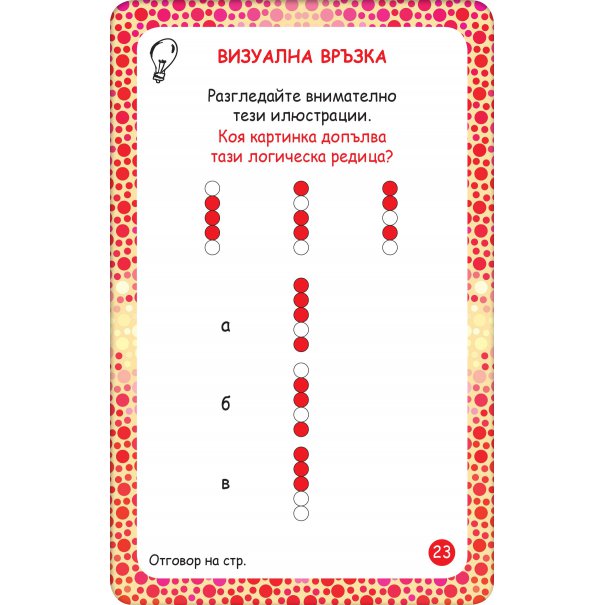 Картите включват задачи с танграм, домино, анаграми и много други. Главоблъсканиците ще предизвикат концентрацията, въображението и съобразителността ви.