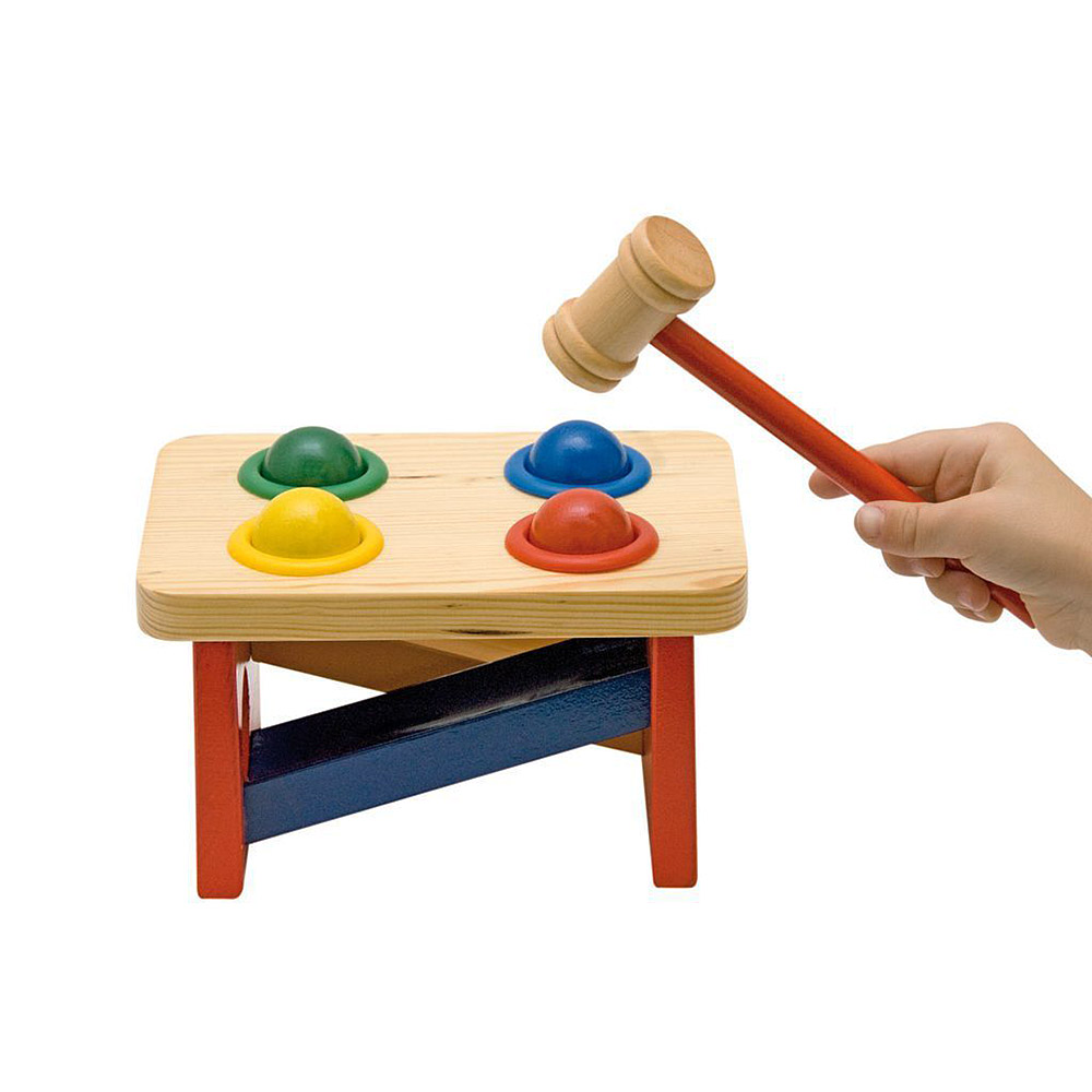 В началото детето трябва да вкара цветните топки в дупките, след което да удря с чукчето докато паднат през дупката и из.....